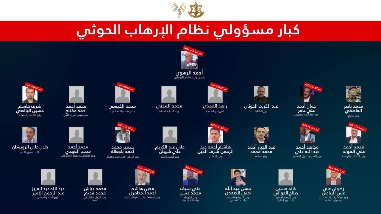 أعلن الجيش الإسرائيلي، مساء الخميس، القضاء على 12 مسؤولا بارزا في قيادة الحوثيين.