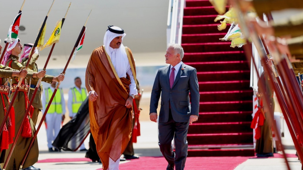 واستقبل جلالة الملك عبدﷲ الثاني، اليوم الأربعاء، سمو الشيخ تميم بن حمد آل ثاني أمير دولة قطر، لدى وصوله عمان في زيارة رسمية للمملكة.