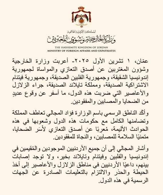 وأكد الناطق الرسمي باسم الوزارة، السفير فؤاد المجالي، تضامن المملكة الكامل مع حكومات وشعوب هذه الدول في هذه الحوادث الأليمة، متمنيًا الشفاء العاجل للمصابين والنجاة للمفقودين، ومقدمًا التعازي لأسر الضحايا.