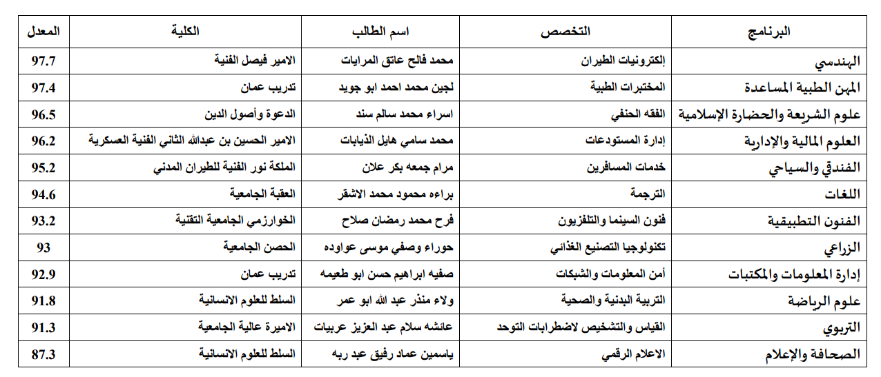 وفيما يلي قائمة الطلبة الأوائل حسب البرامج الدراسية: