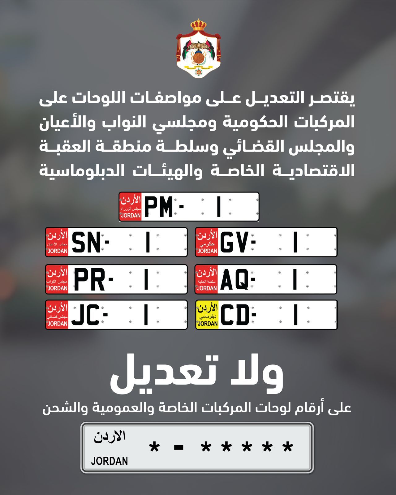 أكدت الحكومة الأحد، أنه لا تعديل على مواصفات اللوحات الخاصة للمركبات، ويشمل التعديل فقط على مواصفات اللوحات الحكومية ولوحات مجلسي النواب والأعيان والمجلس القضائي وسلطة العقبة والهيئات الدبلوماسية.