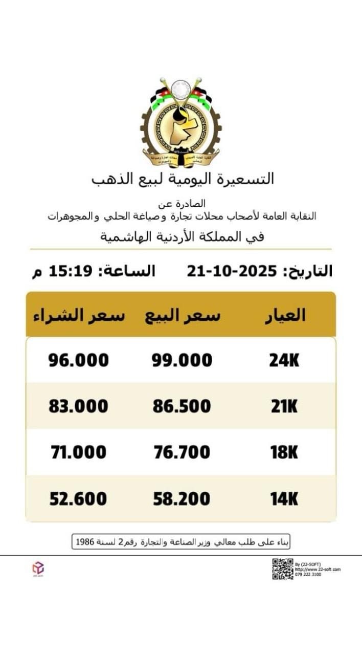 كما بلغ سعر الغرام الواحد من الذهب عيارات 24 و18 و14 لغايات البيع من محالّ الصاغة 99 و76.7 و58.2 دينارًا على التوالي.