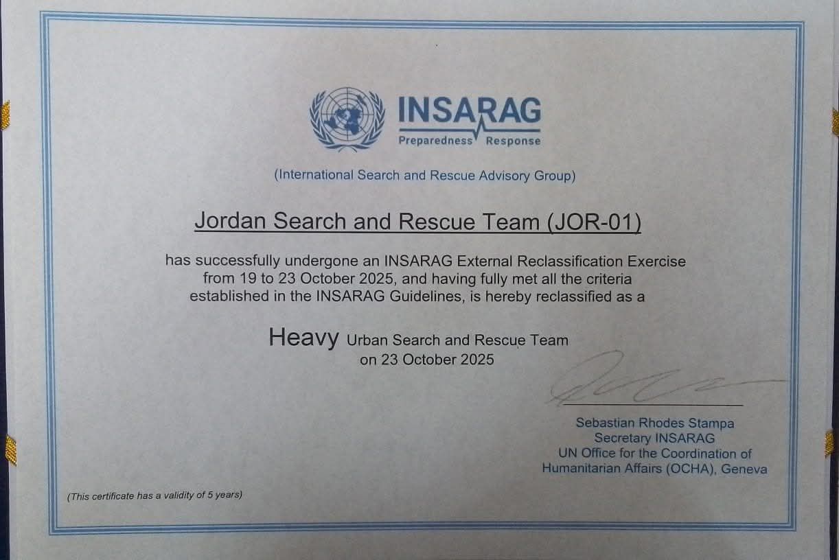 ويُعد فريق البحث والإنقاذ الأردني أول فريق عربي يحصل على التصنيف “الثقيل” منذ عام 2013، واستمر في الحفاظ عليه بفضل الاحتراف المستمر في التدريب، وتطوير القدرات البشرية والتقنية، والالتزام بالمعايير الدولية الخاصة بفرق الطوارئ والإنقاذ.