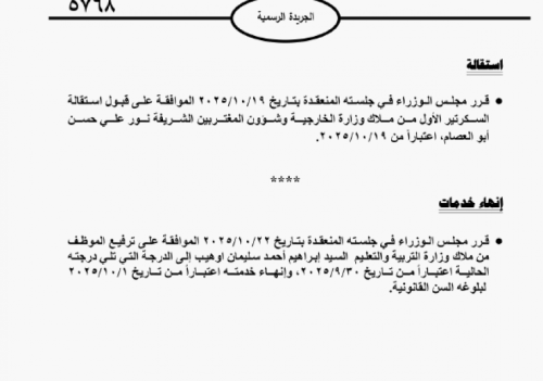 صدر في عدد الجريدة الرسمية، الخميس، قرارات مجلس الوزراء بإحالة عدد من موظفي الدولة إلى التقاعد، وانهاء خدمات اخرين.