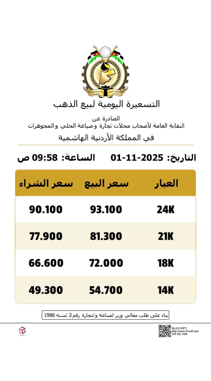 كما سجّل سعر بيع الغرام الواحد من عيار 24 نحو 93.10 دينارًا، وعيار 18 حوالي 72.00 دينارًا، وعيار 14 نحو 54.70 دينارًا.