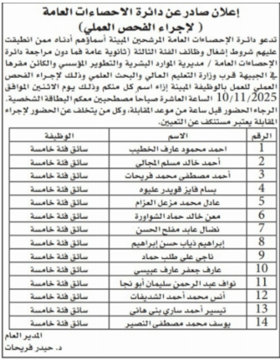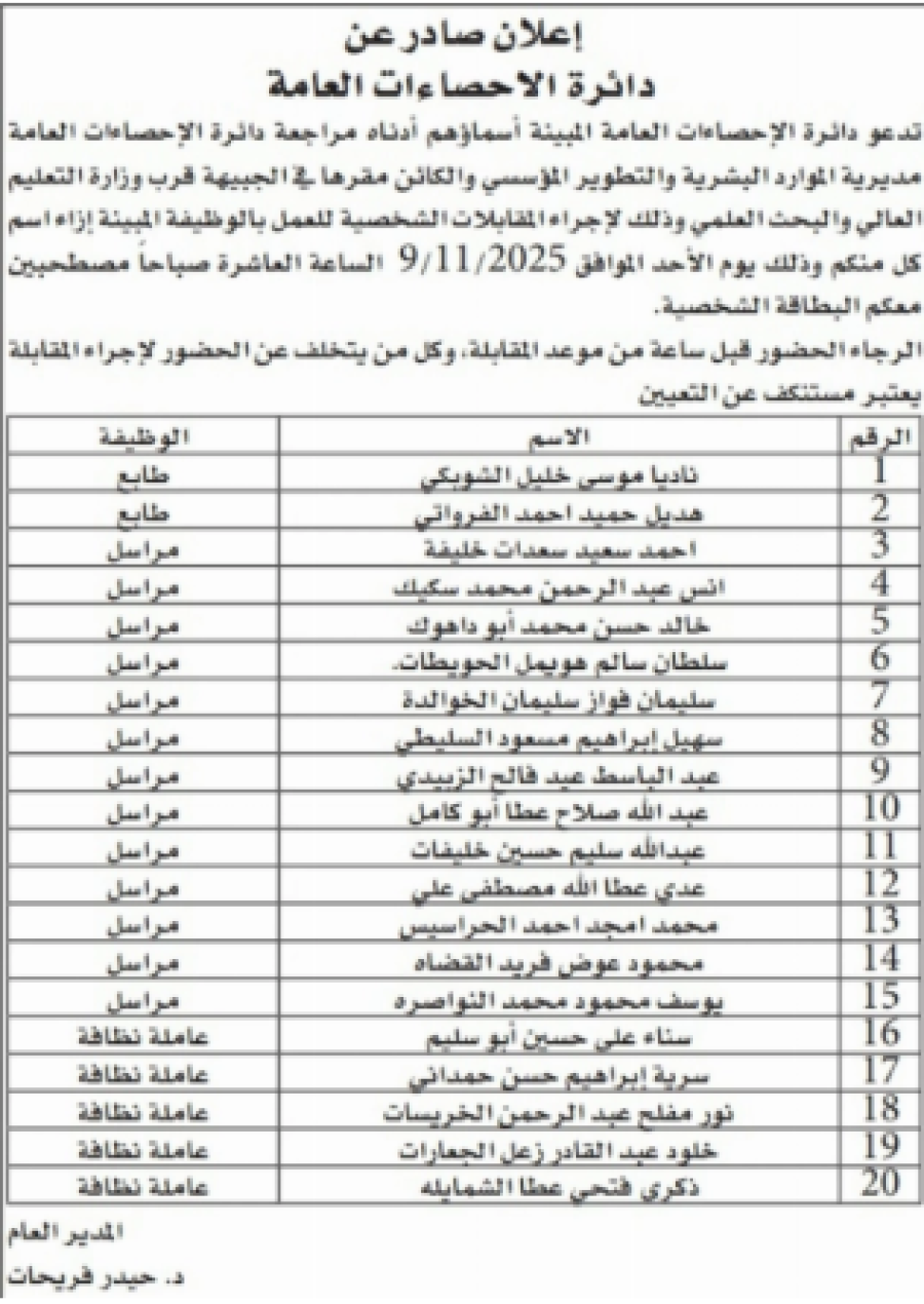 دعت دائرة الاحصاءات العامة الأردنية، المبينة اسماؤهم ادناه مراجعة دائرة الإحصاءات العامة للمقابلات الشخصية في مبنى الدائرة بمنطقة الجبيهة قرب وزارة التعليم العالي والبحث العلمي يوم الأحد 9 / 11/ 2025 الساعة العاشرة صباحا.