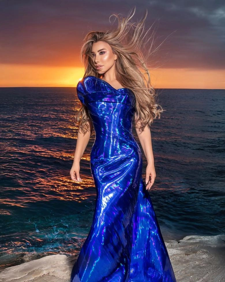 نجوى كرم بالأزرق الميتاليكي بفستان منحوت من نيكولا جبران