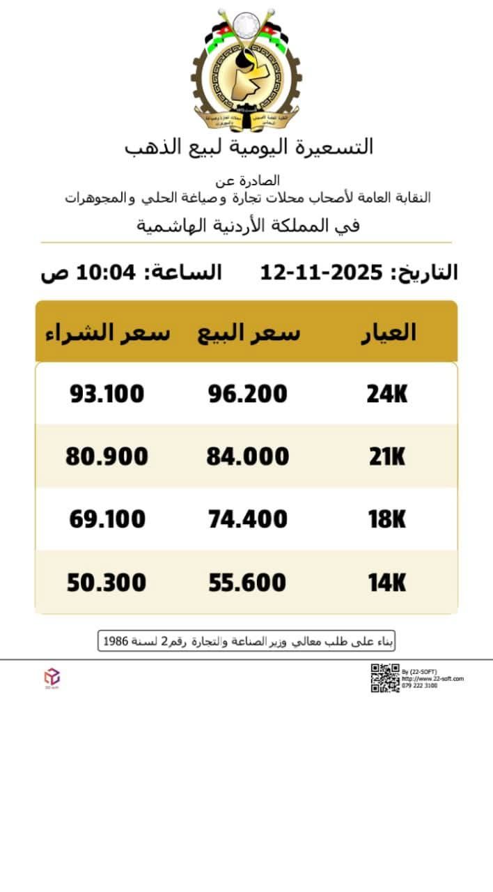 وحسب النشرة الصباحية التي أصدرتها النقابة العامة لأصحاب محلات تجارة وصياغة الحلي والمجوهرات، بلغ سعر الغرام الواحد من الذهب عيارات 24 و18 و14 لغايات البيع من محلات الصاغة عند 96.2 و74.4 و55.6 دينارا على التوالي.