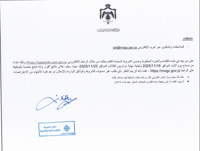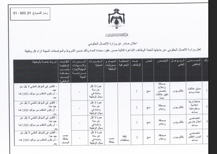 السوسنة - اعلنت وزارة الاتصال الحكومي عن حاجتها لتعبئة الوظائف الشاغرة ضمن عقود محددة المدة وذلك ضمن الشروط والمواصفات المبينة ازاء كل وظيفة.