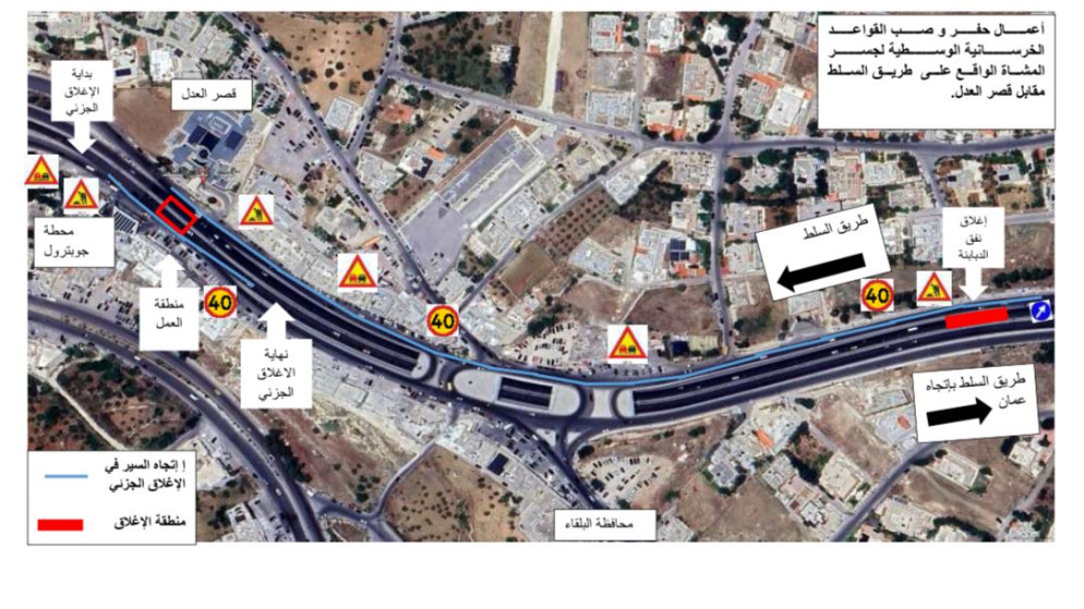 السوسنة - أعلنت وزارة الأشغال العامة والإسكان عن تنفيذ تحويلات مرورية مؤقتة وجزئية على طريق عمان–السلط مقابل قصر العدل في محافظة البلقاء، وذلك ضمن أعمال الحفريات وصب القواعد الخرسانية في الجزيرة الوسطية.