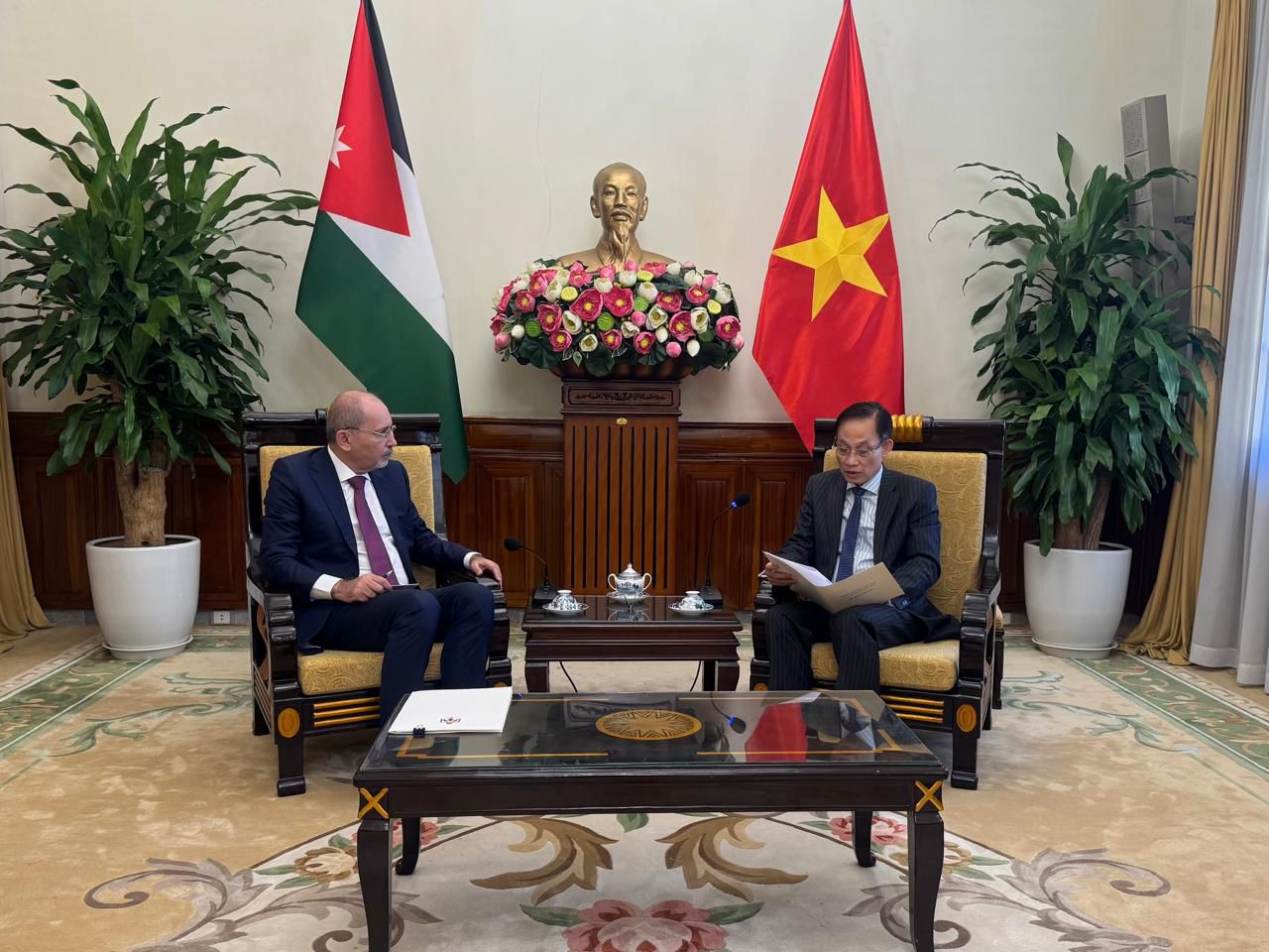 واتفق الوزيران خلال لقائهما على هامش زيارة جلالة الملك عبدالله الثاني إلى فيتنام على عقد الاجتماع الأول للمشاورات السياسية في العام القادم لوضع خريطة طريق محددة لزيادة التعاون في قطاعات التجارة والاستثمار والصحة والتعليم والسياحة وغيرها من القطاعات الحيوية بما يضمن ترجمة مخرجات لقاءات جلالة الملك والقيادة الفيتنامية إلى خطوات عملية تنعكس إيجابا على الأردن وفيتنام.