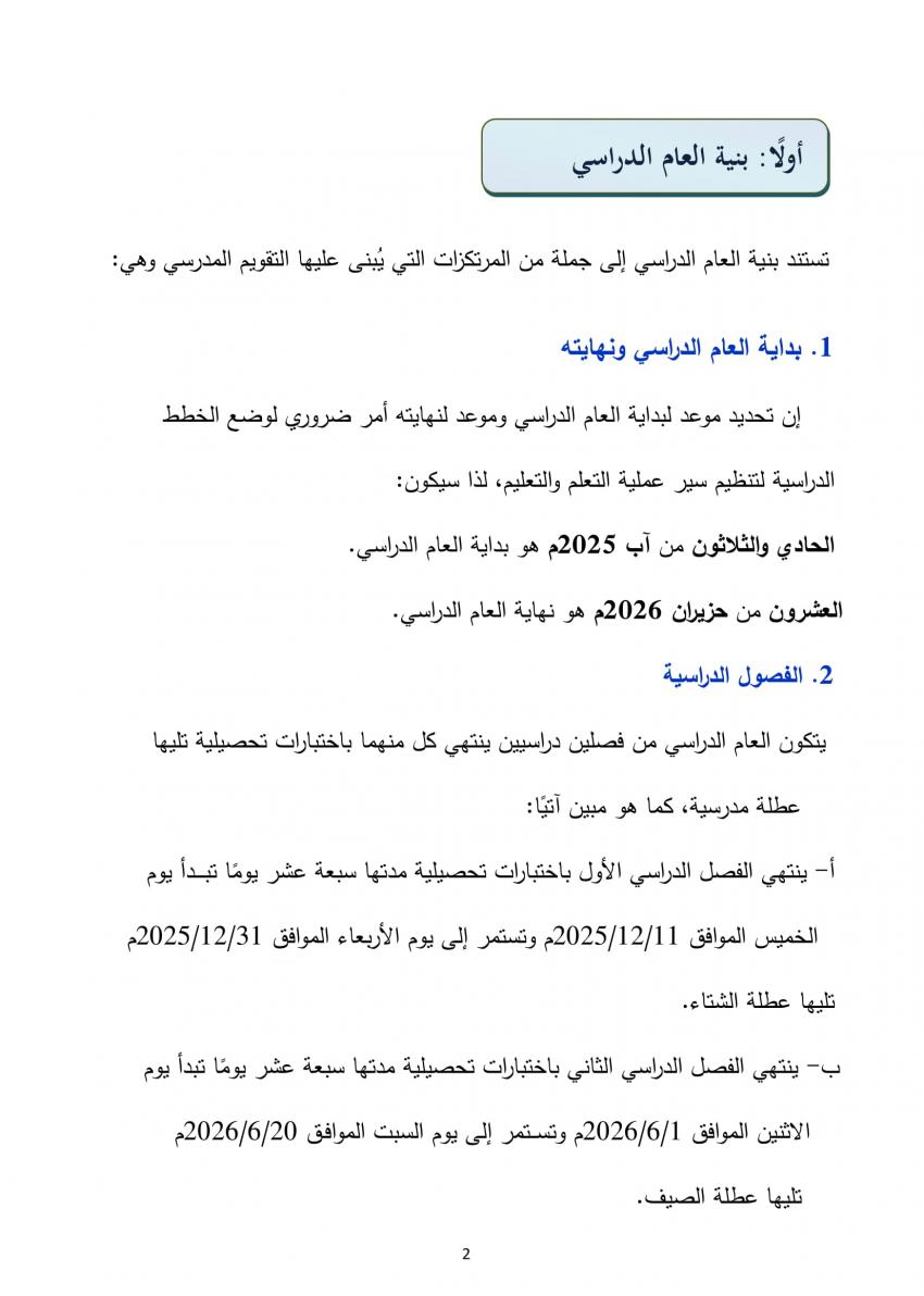 السوسنة - حددت وزارة التربية والتعليم مواعيد عطلة المدارس للعام الدراسي 2025/2026 وفق التقويم الرسمي المعتمد، حيث تبدأ عطلة المدارس الحكومية يوم 11 كانون الثاني 2026 وتستمر حتى 22 كانون الثاني 2026، أي لمدة 11 يوماً.