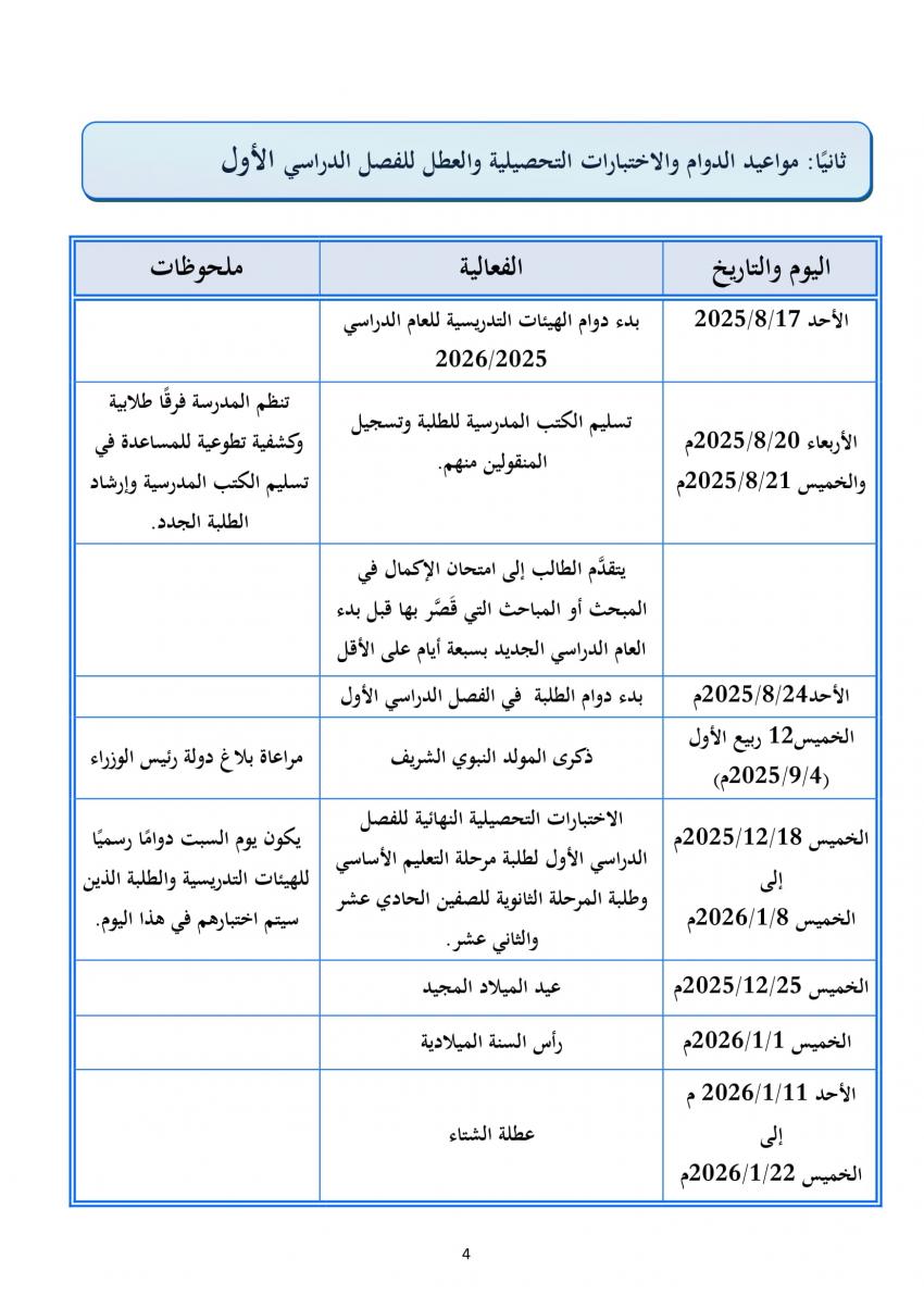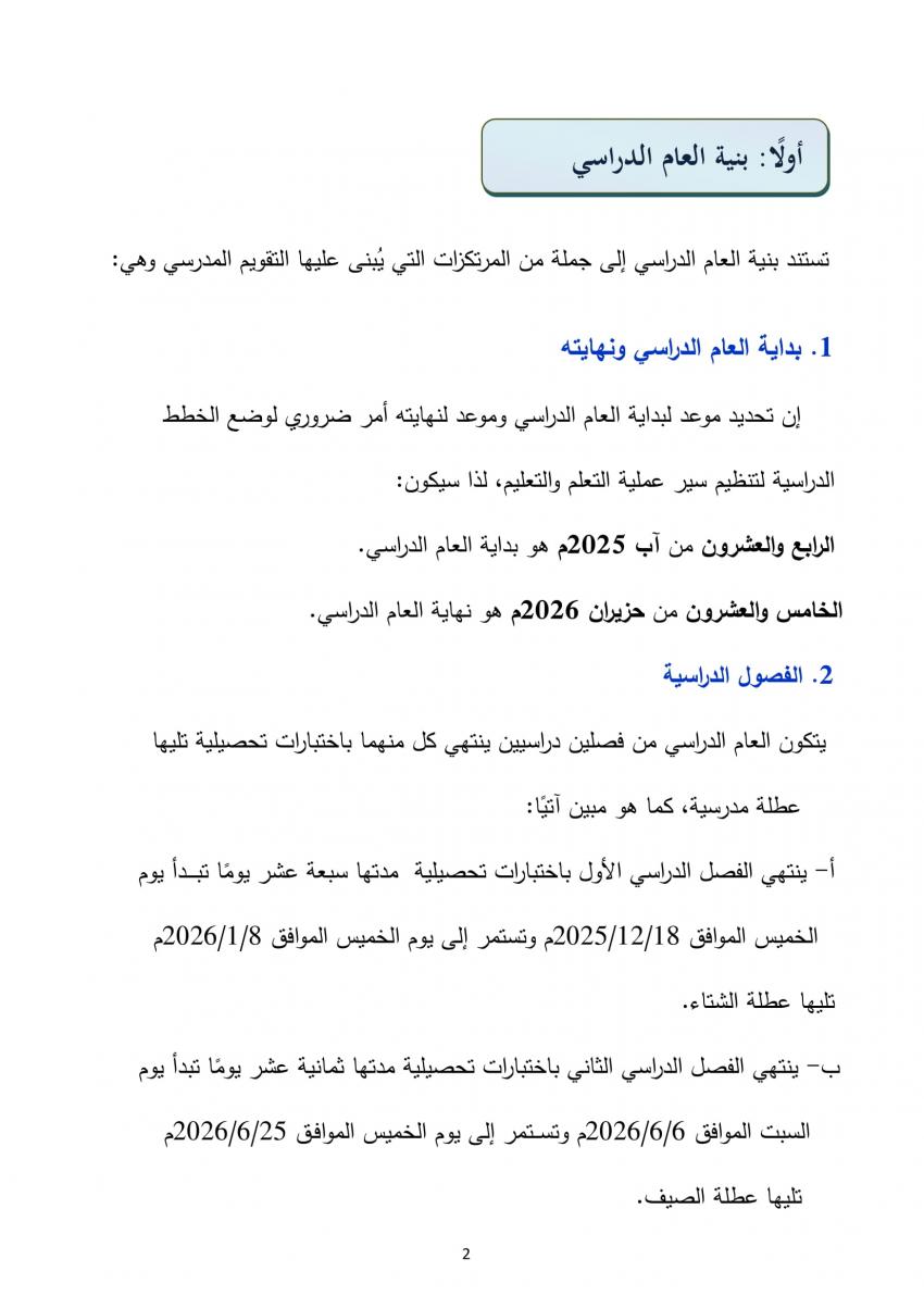 أما عطلة المدارس الخاصة ومدارس وكالة الغوث فستبدأ يوم 4 كانون الثاني 2026 وتستمر حتى 31 كانون الثاني 2026، أي لمدة 27 يوماً، وهو ما يعكس اختلاف أنظمة التعليم بين المدارس الحكومية والخاصة والوكالة.
