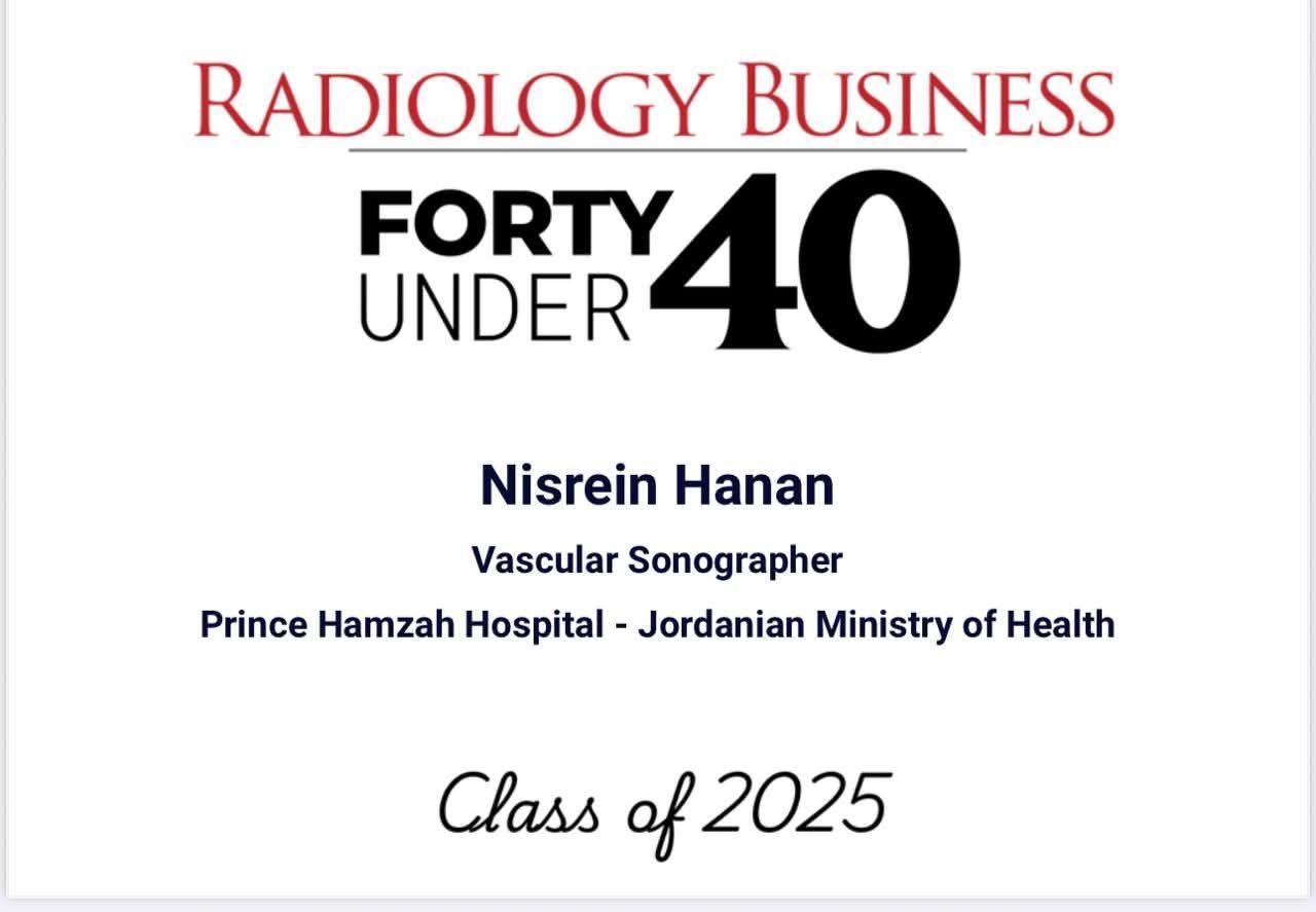 السوسنة - أعلنت مستشفى الأمير حمزة عن فوز الموظفة نسرين حنن، الحاصلة على درجة الماجستير في التصوير الطبي (MSc Medical Ultrasound) والعاملة في قسم الأشعة بوظيفة أخصائية تصوير وعائي، ضمن قائمة أفضل 40 شخصية حول العالم لعام 2025، وهي من أبرز الجوائز الدولية التي تمنح للقادة الشباب المتميزين في مجال التصوير الطبي وإدارة خدمات الأشعة.