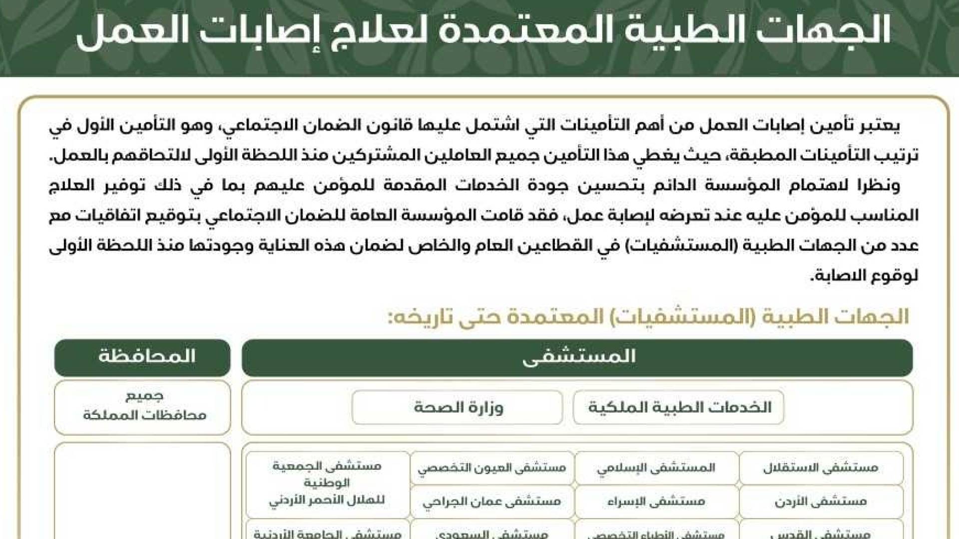 وأوضحت المؤسسة في بيان صحفي صادر عن مركزها الإعلامي أن هذه الخدمة تتيح للمؤمّن عليهم الذين يتعرضون لإصابة أثناء العمل أو بسببه، التوجّه مباشرة إلى المستشفيات المتعاقدة معها والبالغ عددها (45) جهة طبية لتلقي العلاج فوراً، حيث اعتمدت المؤسسة الخدمات الطبية الملكية ووزارة الصحة والقطاع الخاص الموضحة في موقعها الإلكتروني (www.ssc.gov.jo) ضمن خانة المكتبة الإلكترونية، بما يضمن تقديم خدمة طبية عالية الجودة والكفاءة.