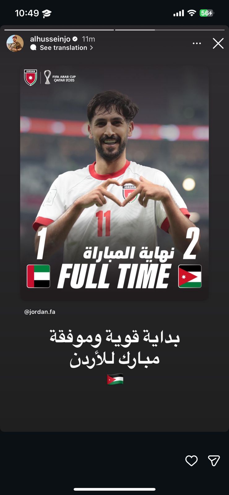 السوسنة - هنأ سمو الأمير الحسين بن عبدالله الثاني، ولي العهد، الأربعاء، المنتخب الوطني لكرة القدم بفوزه على نظيره الإماراتي بنتيجة 2-1، في المباراة التي أُقيمت اليوم في الدوحة ضمن الجولة الأولى من دور المجموعات.