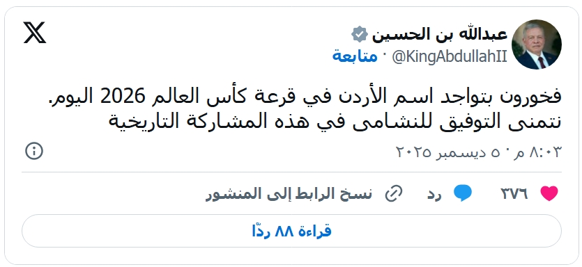 السوسنة - عبر جلالة الملك عبدالله الثاني، الجمعة، عن فخره بتواجد اسم الأردن في قرعة كأس العالم 2026 اليوم.