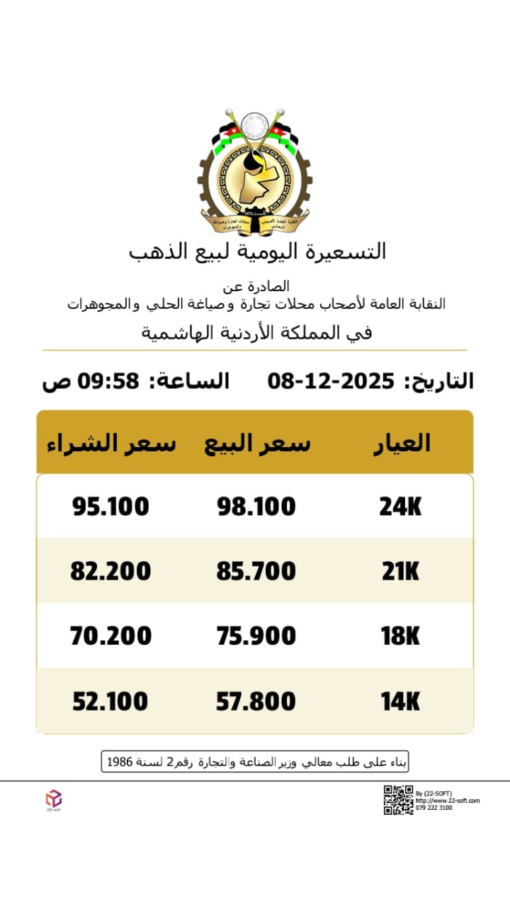 وحسب النشرة اليومية التي أصدرتها النقابة العامة لأصحاب محالّ تجارة وصياغة الحلي والمجوهرات، بلغ سعر الغرام الواحد من الذهب عيارات 24 و18 و14 لغايات البيع من محالّ الصاغة 98.1 و75.9 و57.8 دينارا على الترتيب.