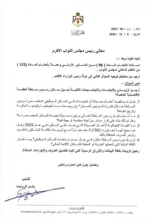 وجه النائب باسم الروابدة، سؤالا نيابيا إلى رئيس الوزراء جعفر حسان، حول تنفيذ أعمال صيانة أو تجديدات في السكن الوظيفي المخصص لرئيس سلطة العقبة الخاصة خلال فترة الرئيس السابق إن وجدت، وما طبيعتها وقيمتها المالية وتاريخ تنفيذها.