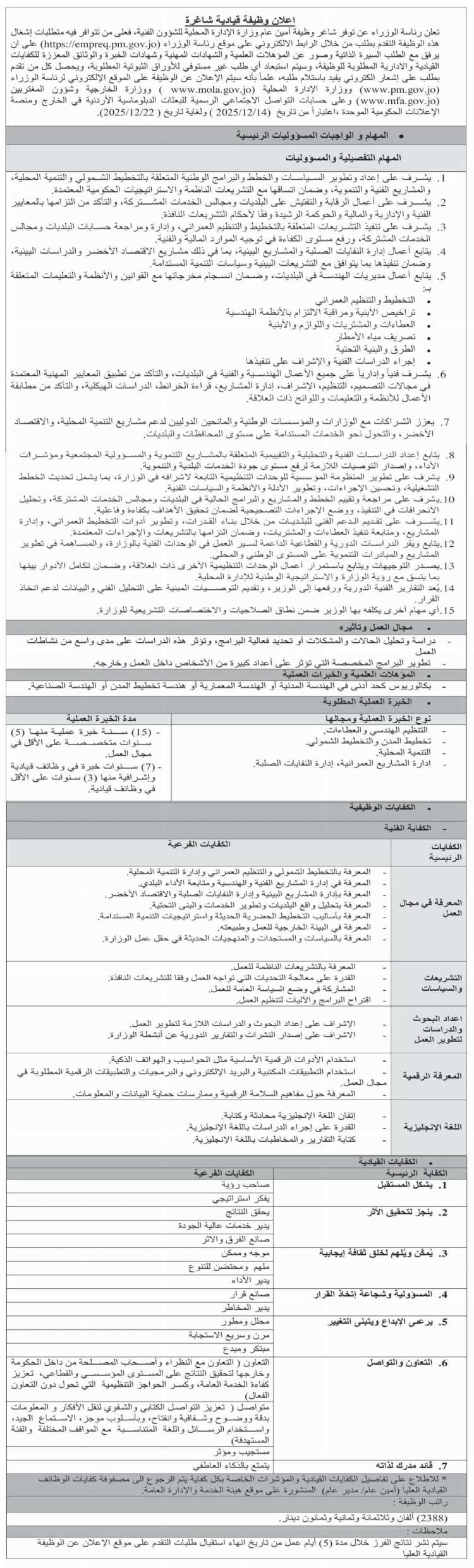 السوسنة - تعلن رئاسة الوزراء عن توفر شاغر وظيفة أمين عام وزارة الادارة المحلية للشؤون الفنية، فعلى من تتوفر فيه متطلبات إشغال هذه الوظيفة التقدم بطلب من خلال الرابط الالكتروني على موقع رئاسة الوزراء http://empreq.pm.gov.jo