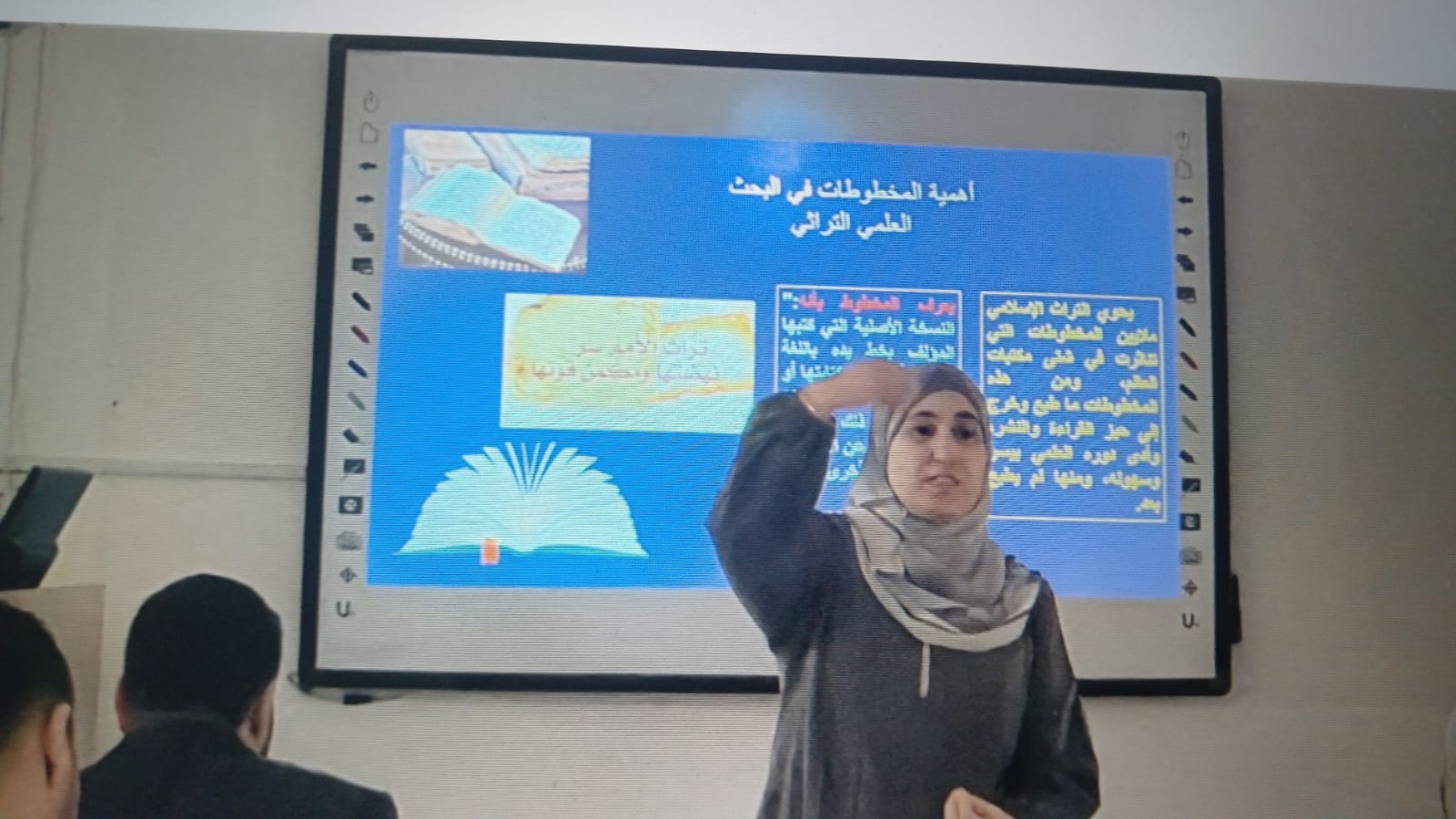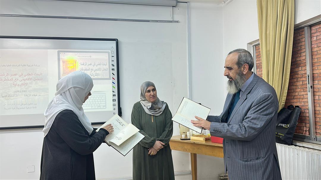 «البحث العلمي في عصر الرقمنة: التعامل الأكاديمي مع المخطوطات الإلكترونية» قدّمتها كلٌّ من د. أسماء الشبول من قسم الدراسات الإسلامية، ود. هيفاء الزيادة من قسم أصول الدين، وبحضور ومشاركة كريمة من الأستاذ الدكتور محمد الطوالبة من قسم أصول الدين. وتناولت د. أسماء الشبول في حديثها مدخلًا إلى رقمنة المعرفة والمخطوطات، وأنواع المخطوطات الإلكترونية وصيغها، إضافة إلى بيان منهجية التعامل الأكاديمي مع المخطوطات الإلكترونية، في حين ركزت د. هيفاء الزيادة على عرض الأدوات والتقنيات التي تساعد الباحث في العمل على المخطوط الإلكتروني، وأخلاقيات التعامل مع المخطوطات الإلكترونية، إلى جانب التعريف بالمواقع المتخصصة بالمخطوطات الإلكترونية. واختُتمت الورشة بتطبيق عملي على التحقيق العلمي، جرى بإشراف وتوجيه وإفادة من الأستاذ الدكتور محمد الطوالبة، بما أسهم في ربط الجانب النظري بالتطبيقي وتعزيز مهارات الطلبة البحثية في هذا المجال.