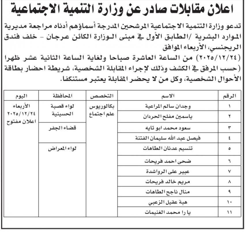 اعلان مقابلات صادر عن وزارة التنمية الاجتماعية - أسماء