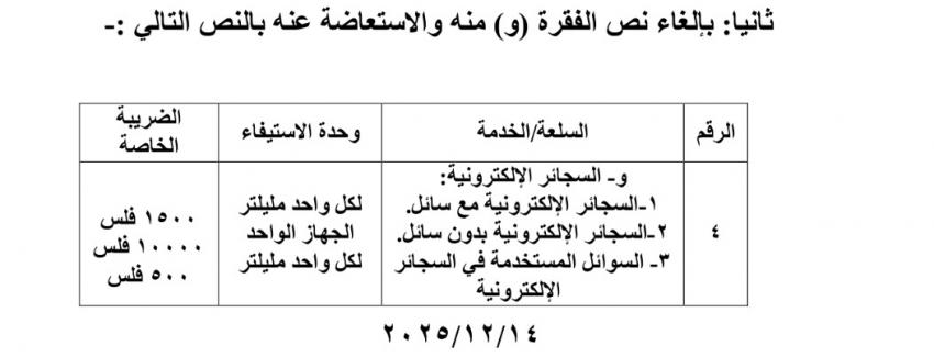 كما خفض النظام المعدل الضريبة الخاصة على السجائر الإلكترونية مع سوائل، والسجائر الإلكترونية بدون سوائل، والسوائل المستخدة في السجائر الإلكترونية، على النحو التالي: