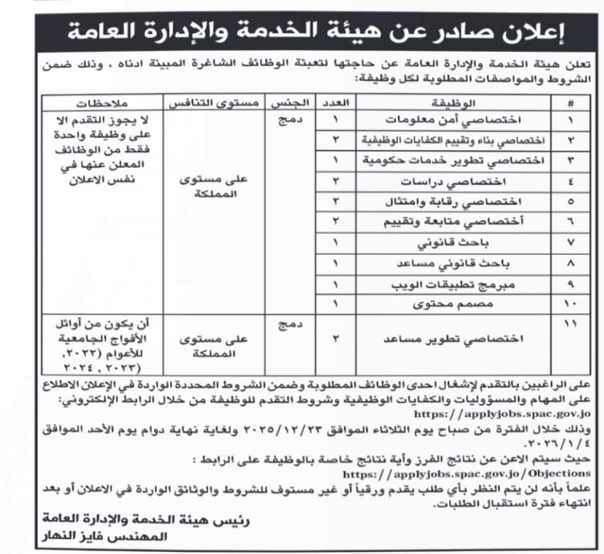 السوسنة - أعلنت هيئة الخدمة والإدارة العامة، حاجتها لتعبئة شواغر وظيفية لصالح الهيئة.