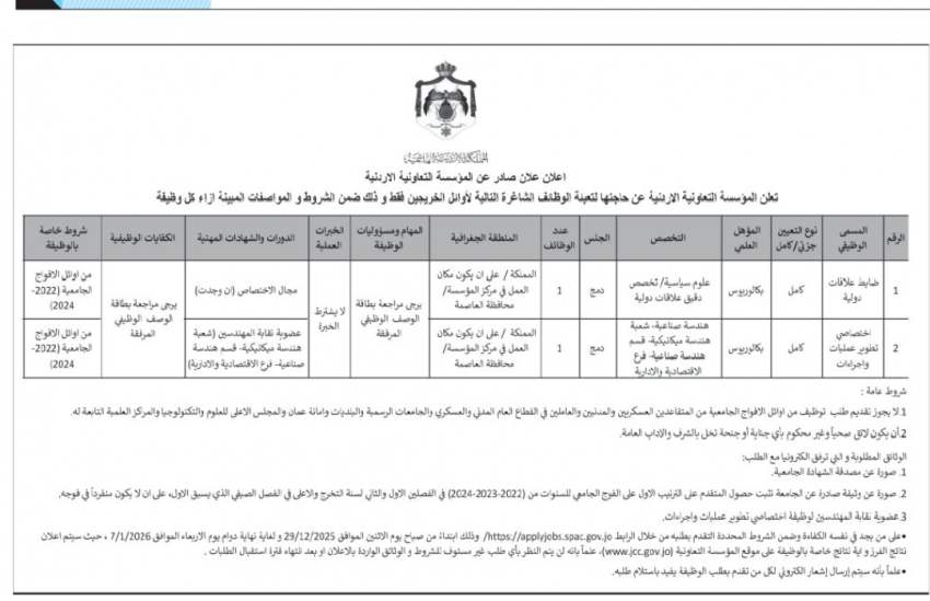 كما أعلنت المؤسسة التعاونية الأردنية، عن حاجتها لتعيين أشخاص.