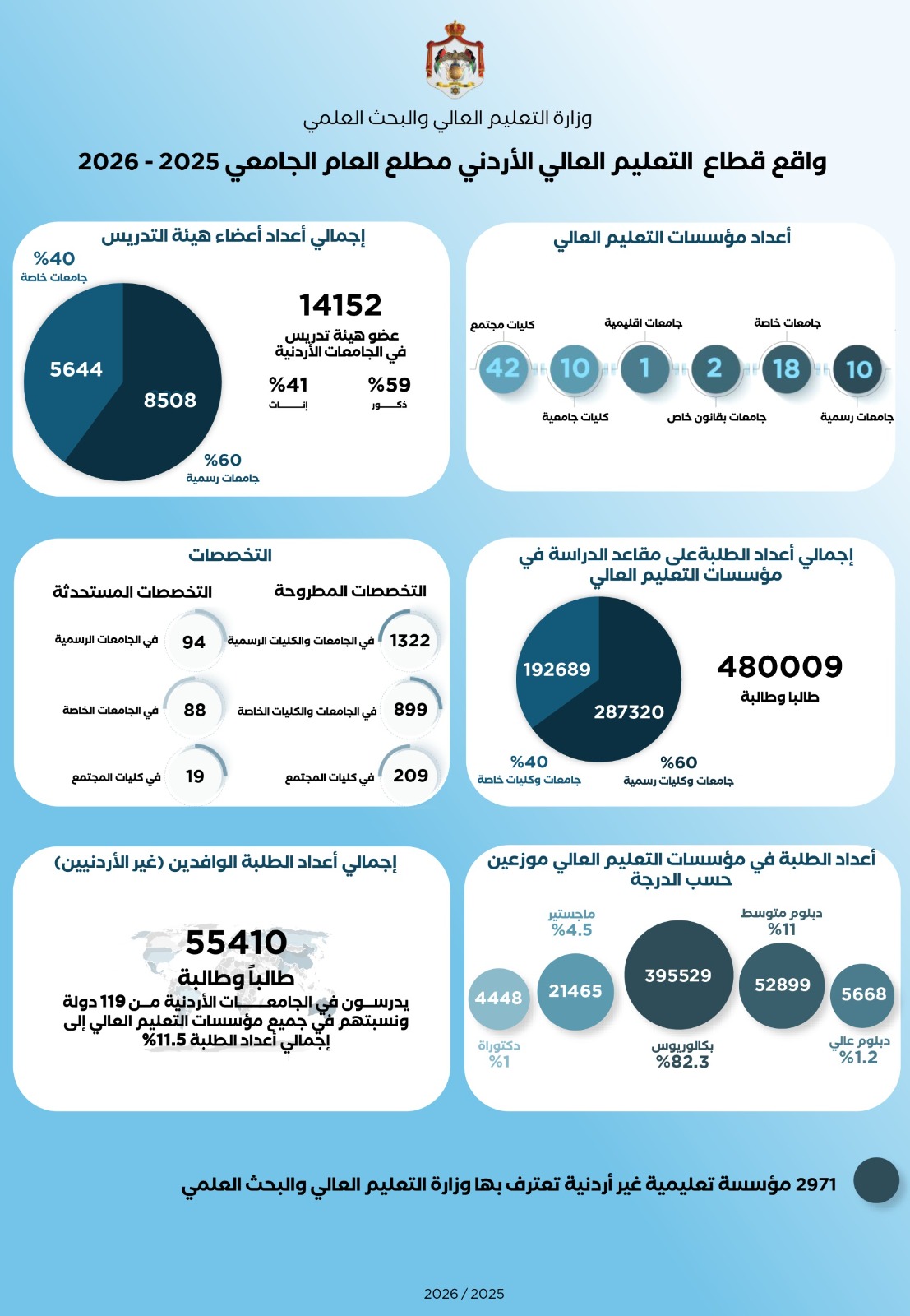 وأظهر البيان أن عدد مؤسسات التعليم العالي في المملكة يشمل 10 جامعات رسمية، و18 جامعة خاصة، وجامعتين بقانون خاص، وجامعة إقليمية واحدة، إضافة إلى 10 كليات جامعية و42 كلية مجتمع. كما بلغ إجمالي عدد أعضاء هيئة التدريس في الجامعات الأردنية 14,152 عضواً، بنسبة 59% ذكور و41% إناث، يتوزعون بين 60% في الجامعات الرسمية و40% في الجامعات الخاصة.
