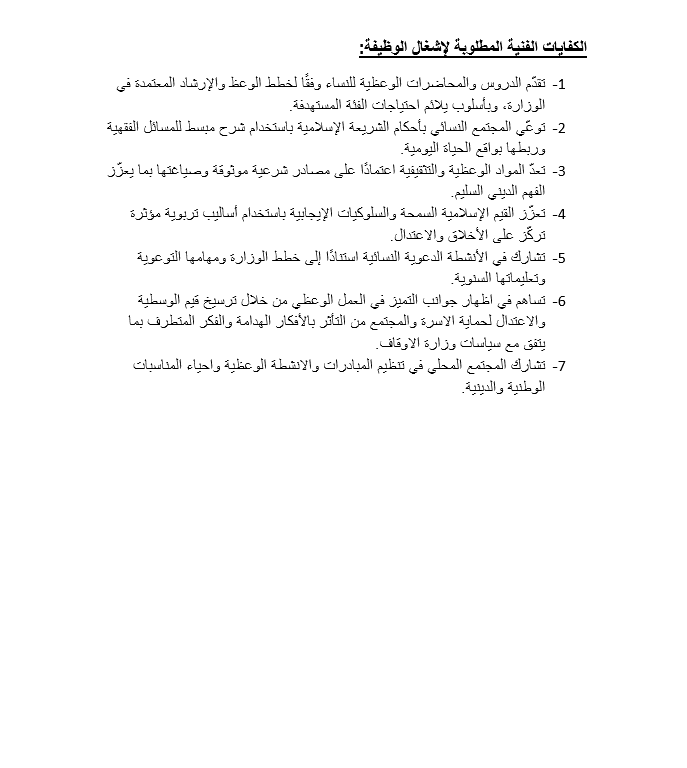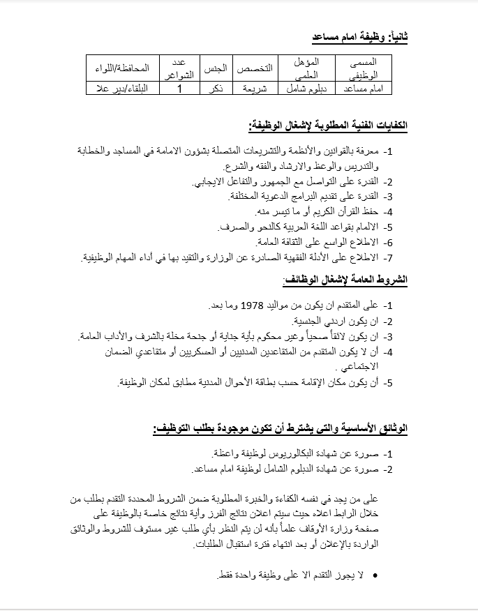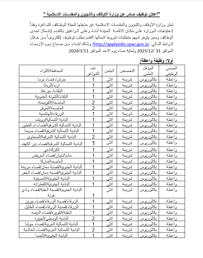 أعلنت وزارة الأوقاف والشؤون والمقدسات الاسلامية عن حاجتها لتعبئة الوظائف الشاغرة وفقاً لاحتياجات الوزارة على مكان الاقامة المبينة في الاعلان المرفق أدناه .