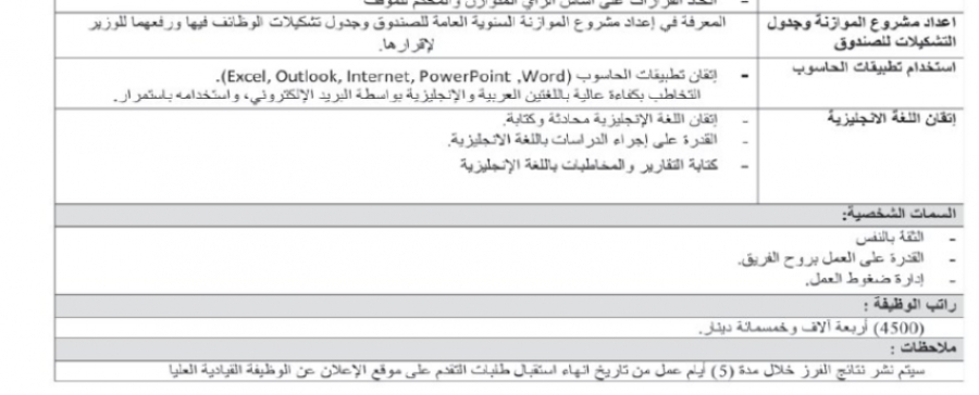 ودعت الحكومة من تتوافر فيه متطلبات إشغال هذه الوظيفة التقدم بطلب من خلال الرابط الالكتروني على موقع رئاسة الوزراء.
