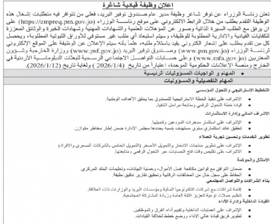 أعلنت رئاسة الوزراء، أمس الأحد، عن توافر شاغر وظيفة مدير عام صندوق توفير البريد.