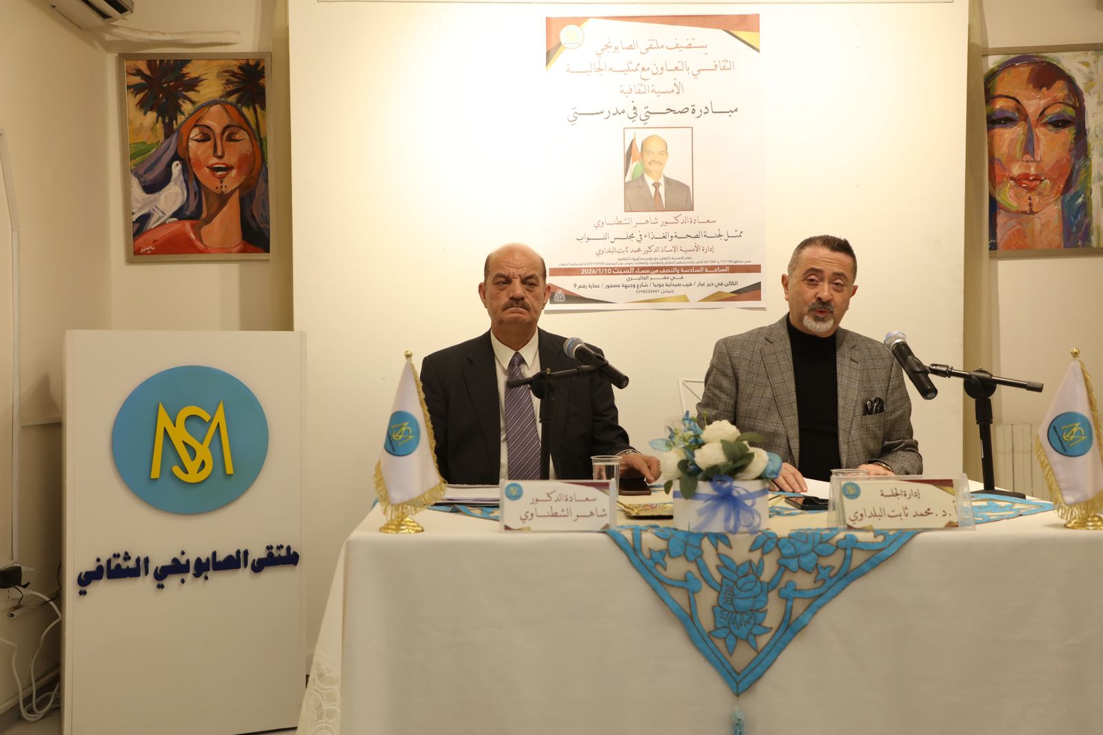 السوسنة - عمان - نظّم ملتقى الصابونجي الثقافي، يوم السبت 10/1/2026، أمسية توعوية، حاضر فيها سعادة الدكتور شاهر الشطناوي، رئيس اللجنة الصحية في مجلس النواب، تناولت مبادرة «صحتي في مدرستي»، وآليات عملها، والفئات المستهدفة، وذلك في إطار الجهود الوطنية الرامية إلى تعزيز مفهوم الصحة العامة داخل المدارس.