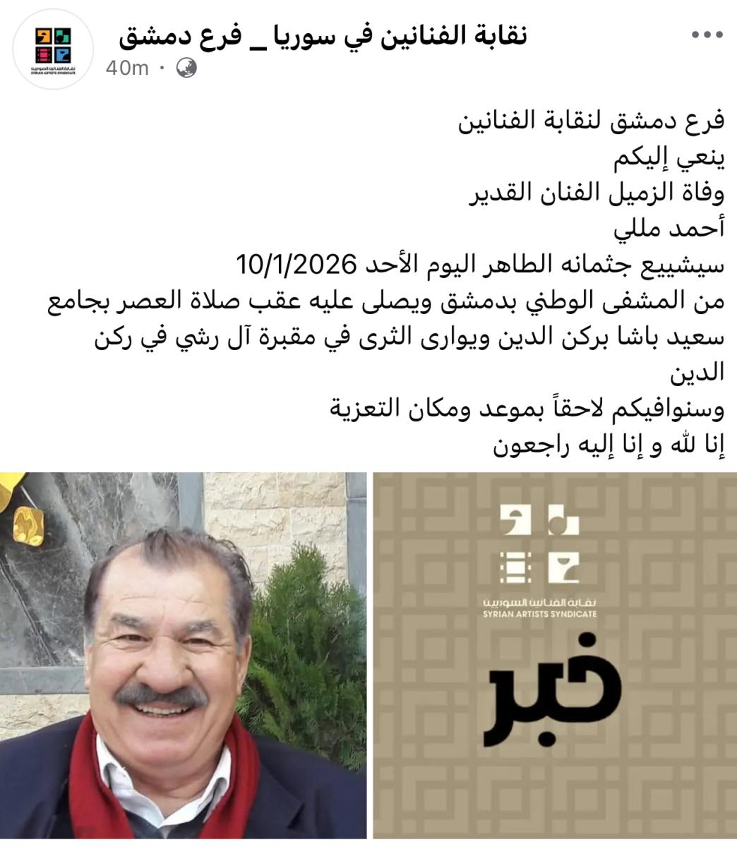 السوسنة - نعت نقابة الفنانين السوريين – فرع دمشق، اليوم، أحمد مللي الذي توفي عن عمر ناهز 80 عامًا، بعد تعرضه لوعكة صحية مفاجئة أُدخل على إثرها إلى أحد مستشفيات دمشق.