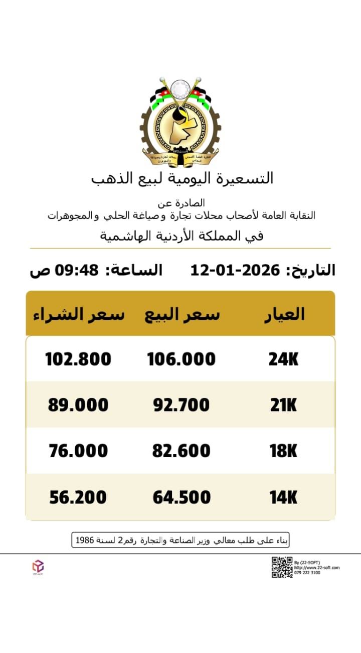 وبلغ سعر الغرام الواحد من الذهب عيارات 24 و18 و14 لغايات البيع من محلات الصاغة عند 106 و82.6 و64.5 دينارا على التوالي.