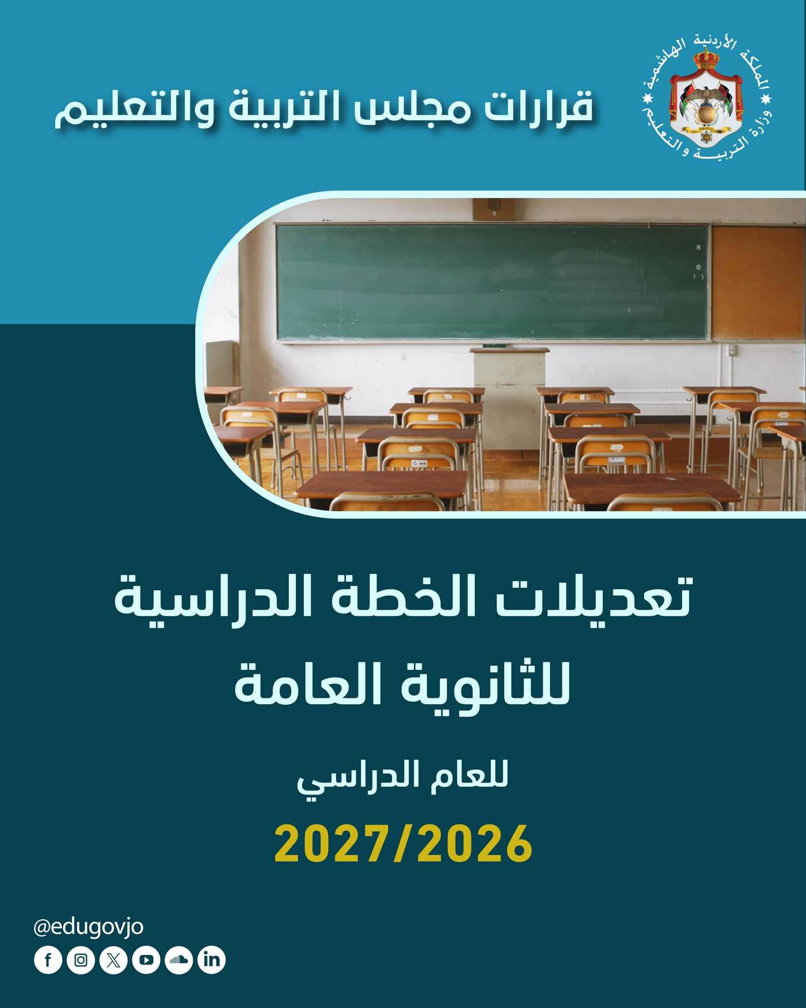 السوسنة - أقرّ مجلس التربية والتعليم تعديلات على الخطة الدراسية لمرحلة الثانوية العامة، يبدأ تطبيقها اعتبارًا من العام الدراسي 2026/2027، وذلك في إطار جهود وزارة التربية والتعليم المستمرة لتجويد العملية التعليمية وتحسين مخرجاتها، وبناء على التغذية الراجعة الواردة من الميدان التربوي، وآراء المختصين والخبراء.