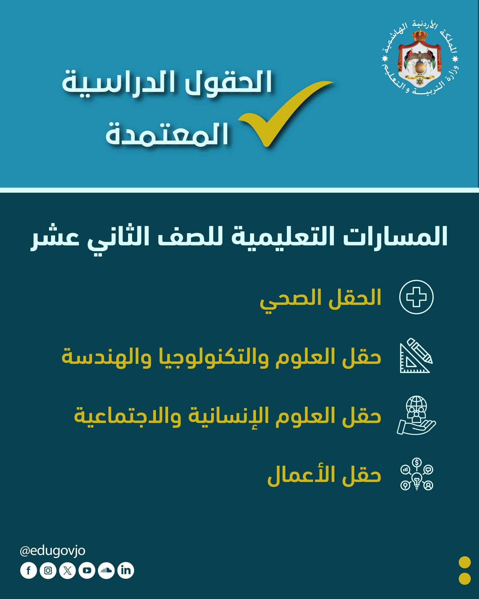 وبيّنت وزارة التربية والتعليم أن التعديلات الجديدة ركزت على زيادة تخصصية الحقول الدراسية، بحيث يدرس الطلبة في الحقول ذات التوجهات العلمية المباحث ذاتها، وتكون غالبية هذه المباحث علمية، فيما تكون غالبية المباحث في الحقول ذات التوجهات الإنسانية مباحث إنسانية، وبما يعزز عمق التخصص ويراعي ميول الطلبة وقدراتهم الأكاديمية.