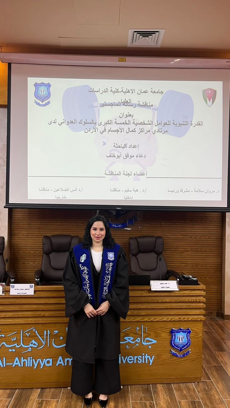 ووجّهت شكرًا خاصًا إلى رئيس الاتحاد الأردني لبناء الأجسام واللياقة البدنية السيد مأمون تيف، تقديرًا لتعاونه ودعمه المهني، إضافة إلى شكرها للاتحاد الأردني ومراكز الأندية والمشاركين في الدراسة، لما أبدوه من تعاون أسهم بشكل مباشر في إنجاح البحث وتحقيق أهدافه، بما يخدم تطوير المجال الرياضي ورفع الوعي بالممارسات الصحية والسلوكية.