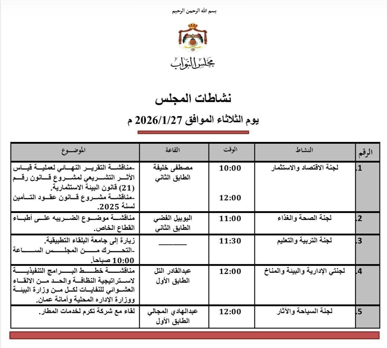 كما تناقش لجنة الاقتصاد والاستثمار التقرير النهائي لعملية قياس الأثر التشريعي لقانون البيئة الاستثمارية، ومشروع قانون عقود التأمين لسنة 2025.