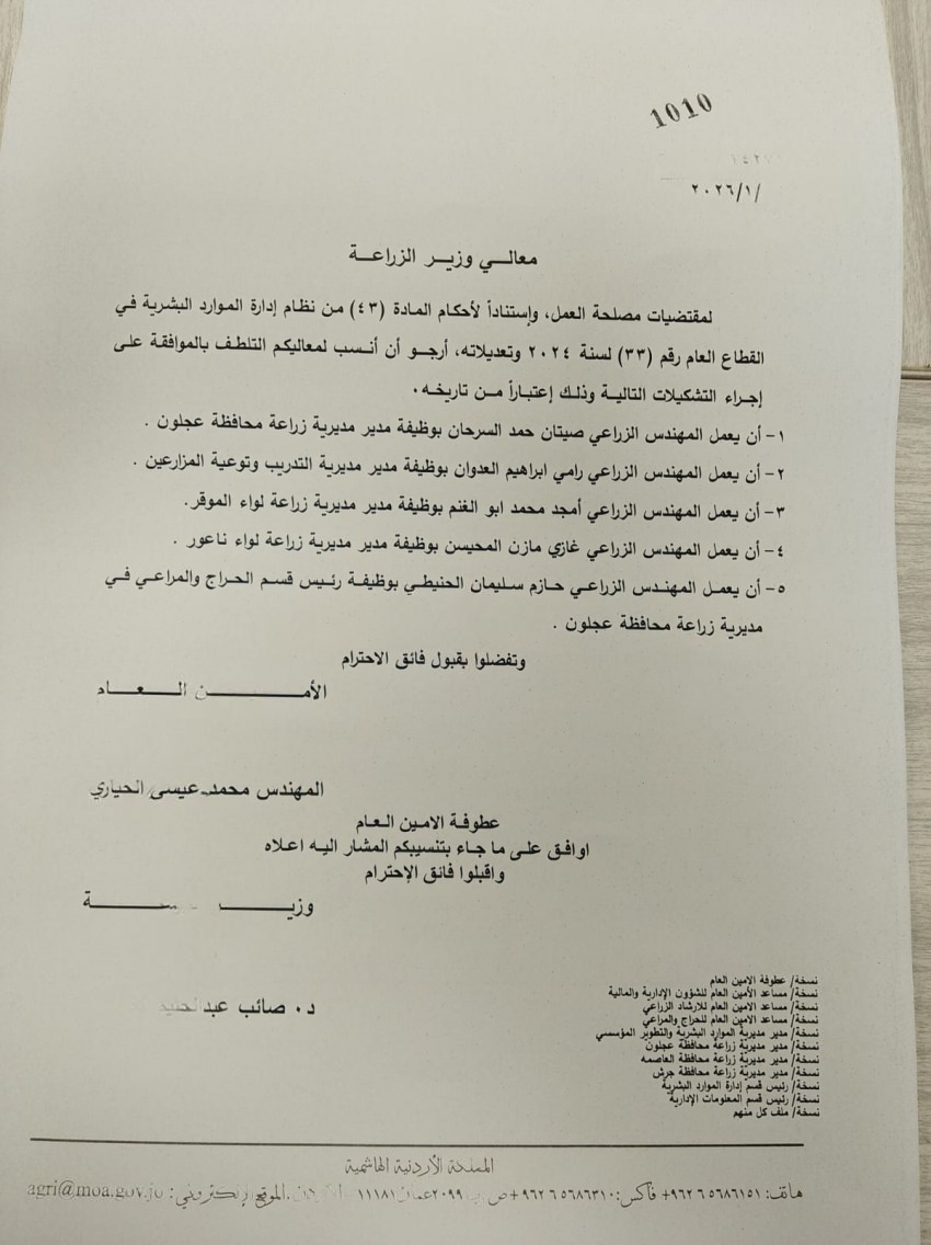وجاءت التشكيلات بتعيين مدراء زراعة في كل من محافظات عجلون والموقر وناعور، إضافة إلى تعيين مدير جديد لمديرية التدريب وتوعية المزارعين.