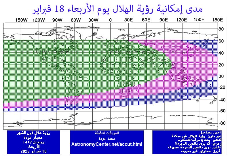 تبين الخرائط التالية من معيار عودة، مدى إمكانية رؤية هلال شهر رمضان يومي الثلاثاء 17 شباط والأربعاء 18 شباط من جميع مناطق العالم، بحيث أن رؤية الهلال مستحيلة من المناطق الواقعة في اللون الأحمر بسبب غروب القمر قبل غروب الشمس أو/و بسبب حصول الاقتران السطحي بعد غروب الشمس.