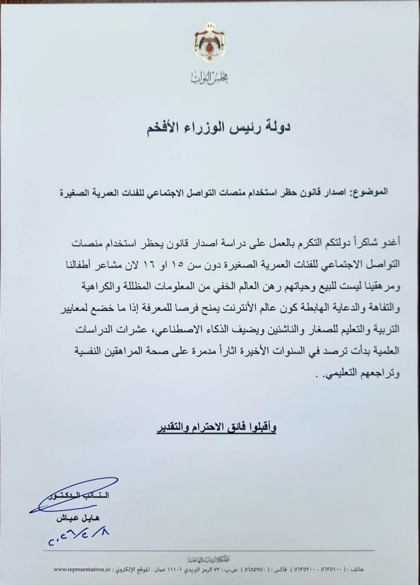 السوسنة - وجّه النائب الدكتور هائل عياش كتاباً رسمياً إلى رئيس الوزراء، دعا فيه إلى إصدار قانون يحظر استخدام منصات التواصل الاجتماعي للفئات العمرية الصغيرة دون سن 15 أو 16 عاماً، وذلك حفاظاً على الصحة النفسية للأطفال وحمايتهم من مخاطر العالم الرقمي.