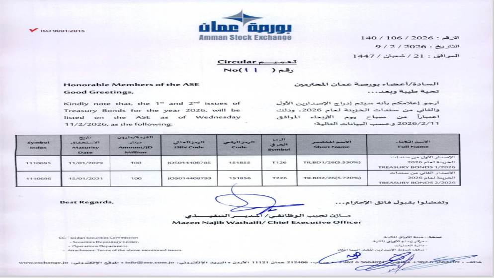طرح سندات خزينة بقيمة 200 مليون دينار الأربعاء