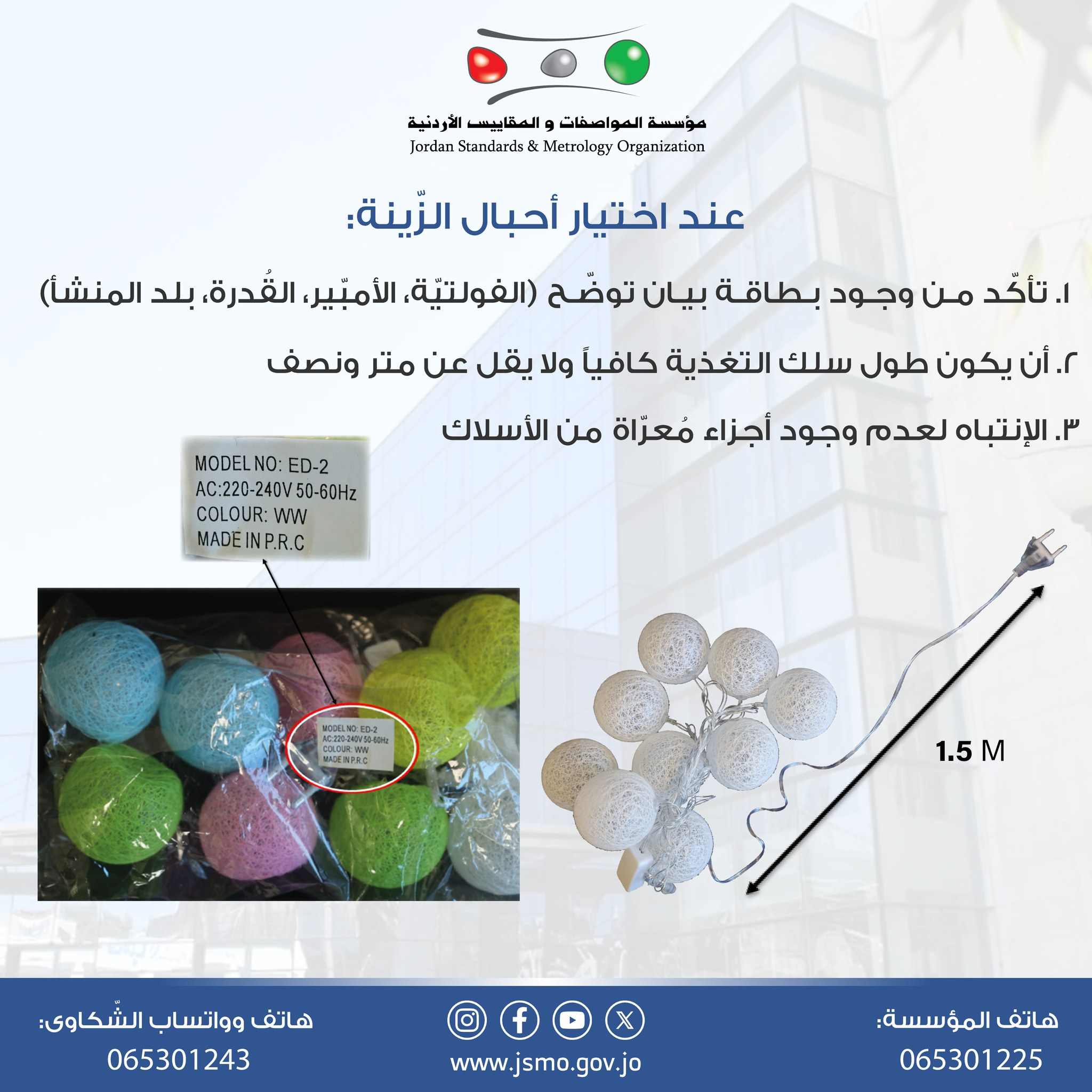 السوسنة - مع اقتراب شهر رمضان المبارك، نصحت مؤسسة المواصفات والمقاييس الأردنية المواطنين عند اختيار أحبال الإنارة والزينة الرمضانية بضرورة الانتباه إلى عدد من الأمور المهمة لضمان السلامة: