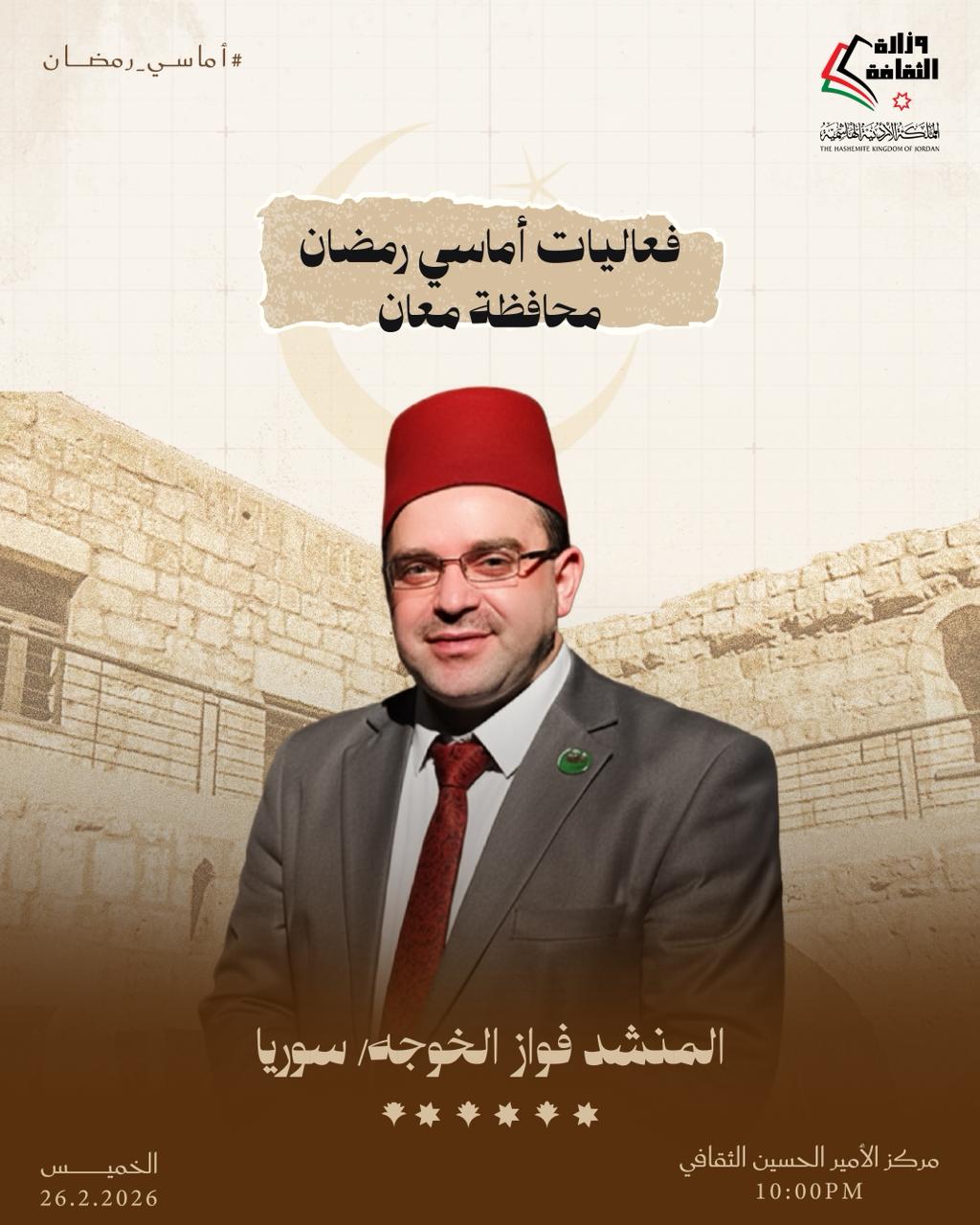 وفي محافظة الكرك، يستضيف مركز الأمير الحسن الثقافي عند الساعة العاشرة مساءً حفلًا إنشاديًا تحييه فرقة «أنوار الشام» من سوريا، مقدمةً باقة من الأناشيد الدينية والتراثية.