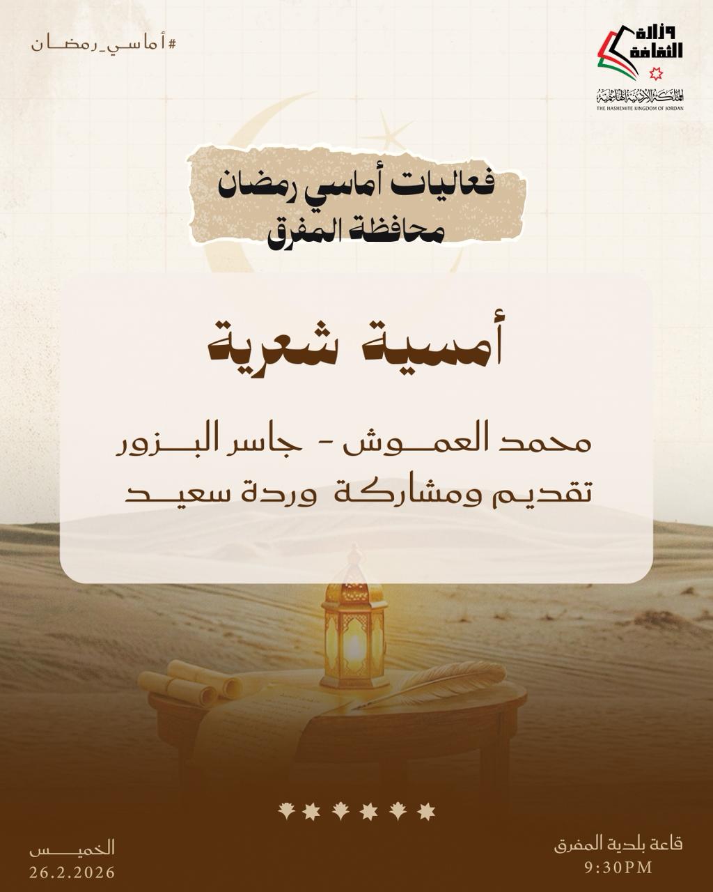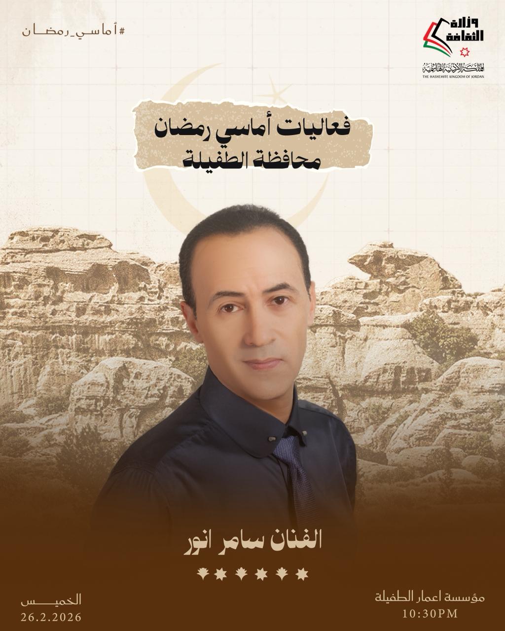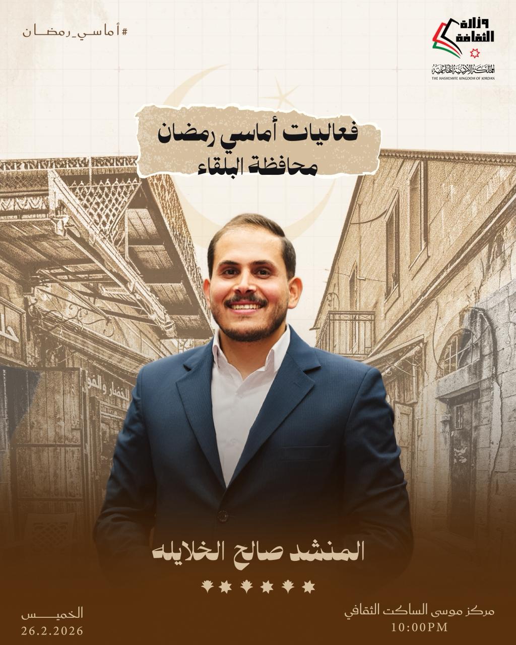 السوسنة - تواصل وزارة الثقافة تنفيذ برنامج «أماسي رمضان» من خلال حزمة فعاليات ثقافية وفنية تقام مساء الخميس المقبل في عدد من محافظات المملكة، انسجامًا مع ما يحمله الشهر الفضيل من قيم روحية واجتماعية، وذلك في المراكز الثقافية بالمحافظات من الساعة التاسعة والنصف مساءً وحتى الثانية عشرة ليلًا.