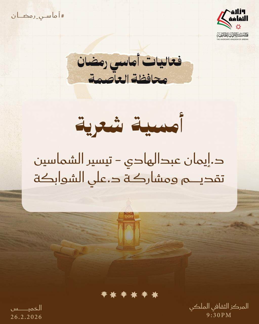 ففي محافظة العاصمة، يحتضن المركز الثقافي الملكي عند الساعة التاسعة والنصف مساءً أمسية شعرية بمشاركة الدكتورة إيمان عبد الهادي وتيسير الشماسين، ويقدمها ويشارك فيها الدكتور علي الشوابكة.