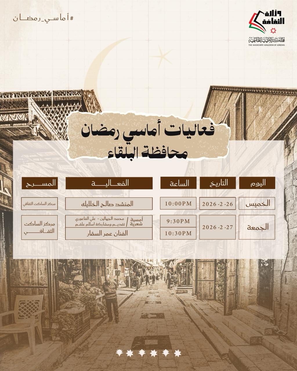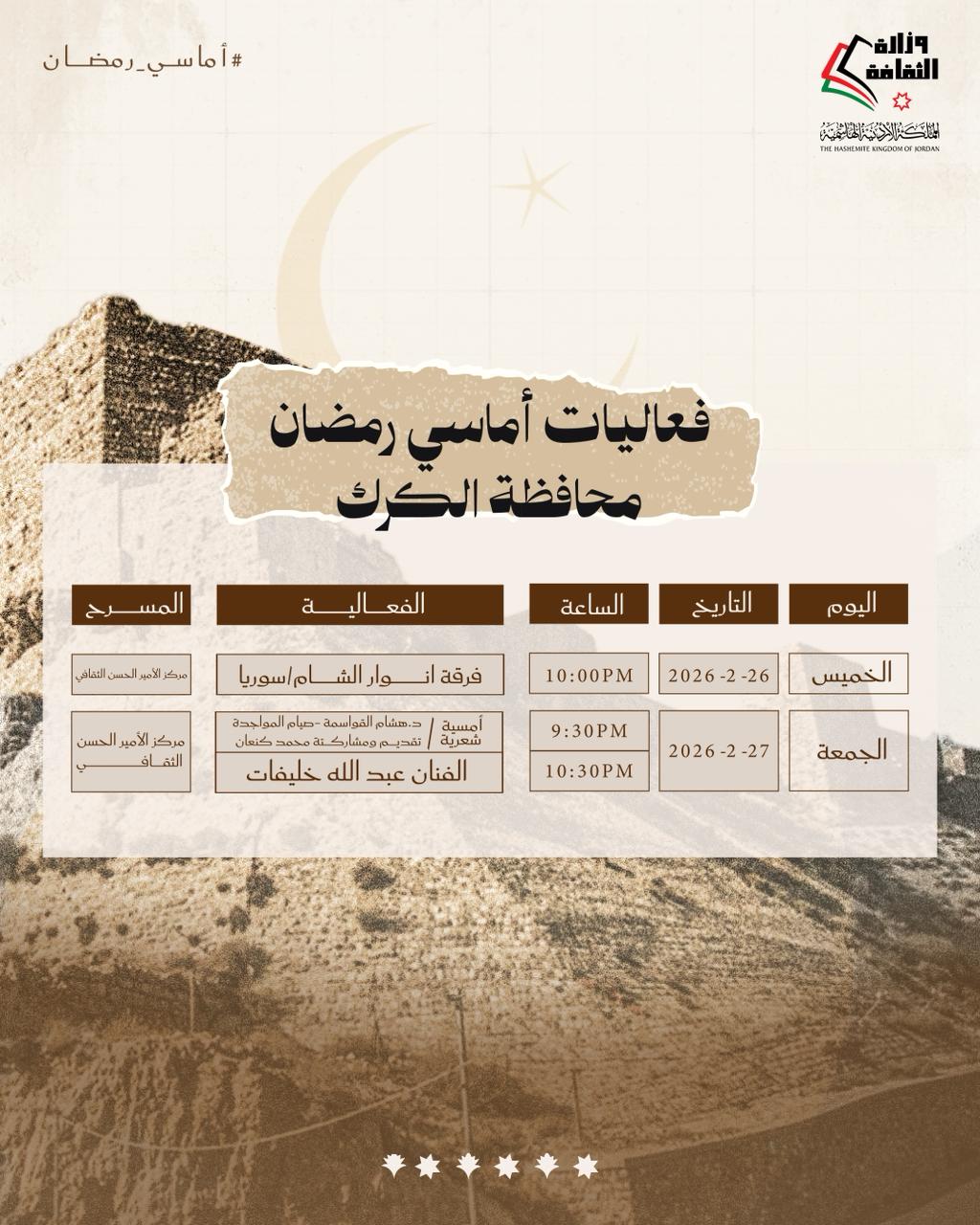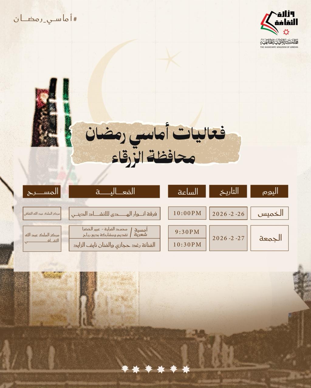 السوسنة - تواصل وزارة الثقافة تنفيذ برنامج «أماسي رمضان» من خلال حزمة فعاليات ثقافية وفنية تقام مساء الخميس والجمعة المقبلين، في عدد من محافظات المملكة، انسجامًا مع ما يحمله الشهر الفضيل من قيم روحية واجتماعية، وذلك في المراكز الثقافية بالمحافظات من الساعة التاسعة والنصف مساءً وحتى الثانية عشرة ليلًا.