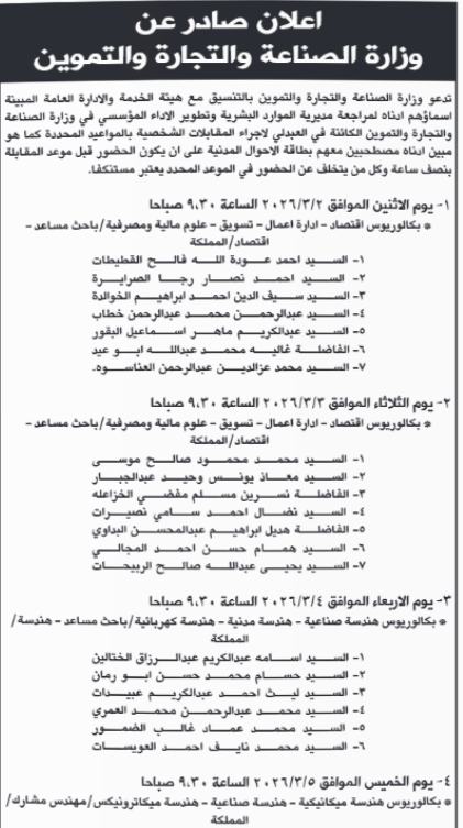 دعت وزارة الصناعة والتجارة والتموين بالتنسيق مع هيئة الخدمة والادارة العامة المبينة اسماؤهم ادناه مراجع مديرية الموارد البشرية وتطوير الاداء المؤسسي في وزارة الصناعة والتجارة وذلك لاجراء المقابلات الشخصية بالمواعيد المحددة.